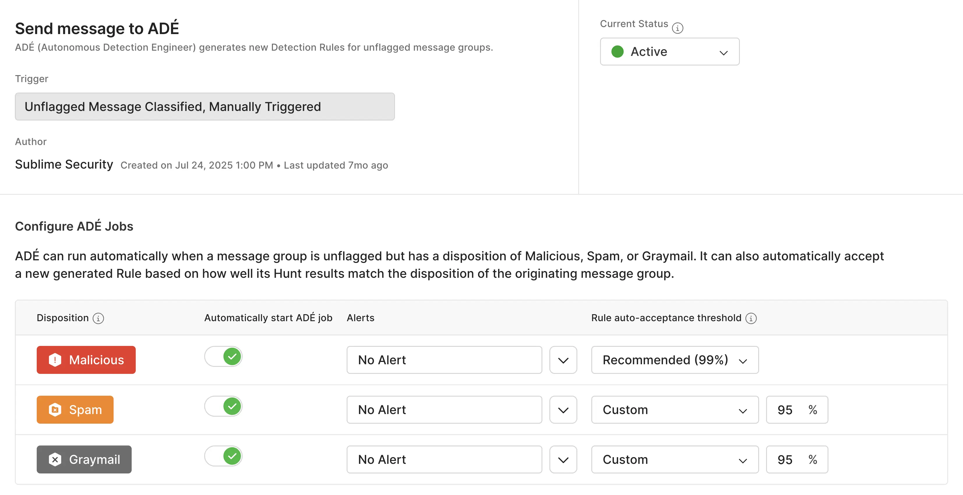 During beta, ADÉ created new coverage for malicious messages. In GA, ADÉ now generates coverage across malicious, spam, and graymail – so new threats don't slip through the noise. If auto-start is enabled, messages are automatically passed to ADÉ. Teams can also send messages to ADÉ manually.