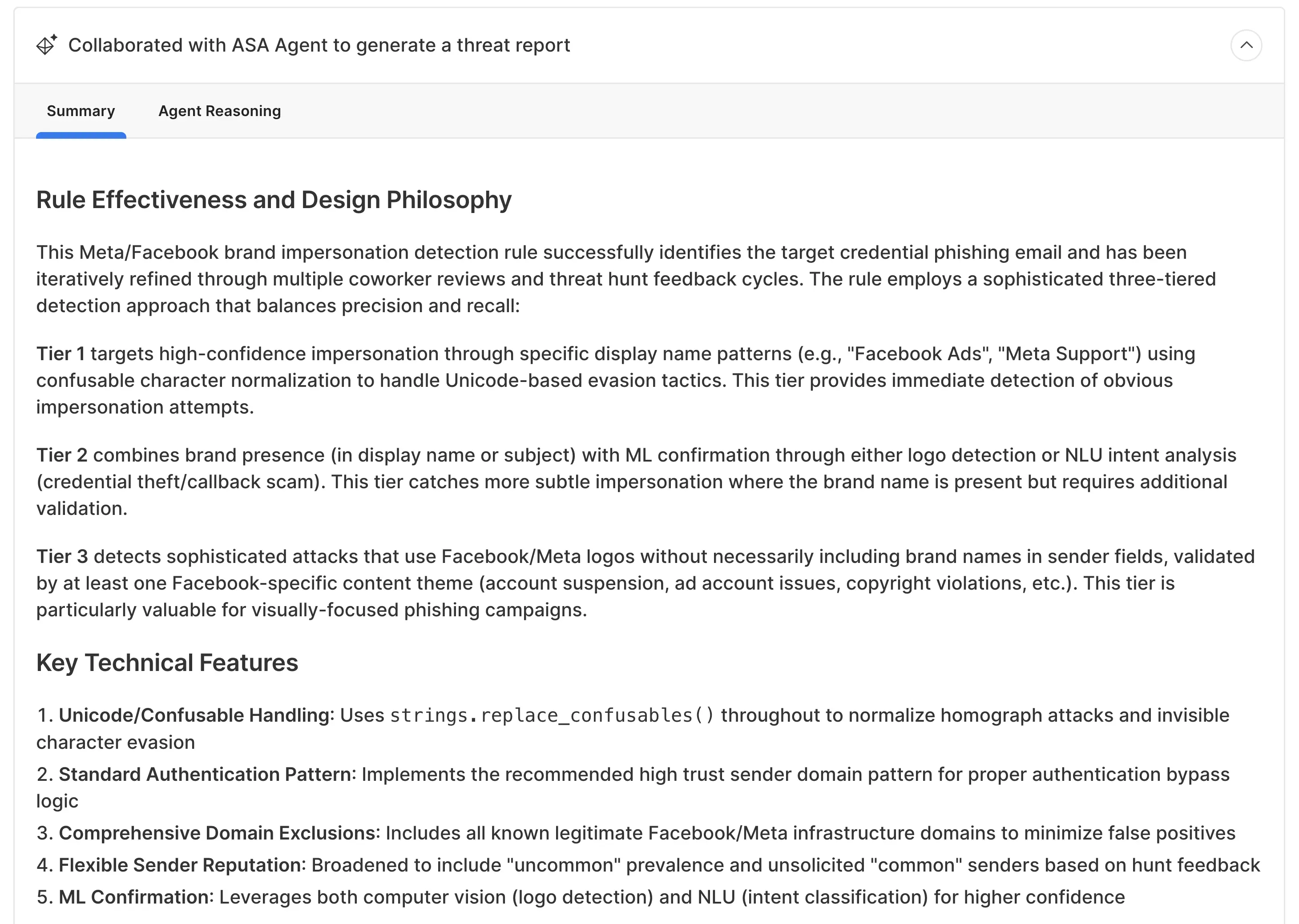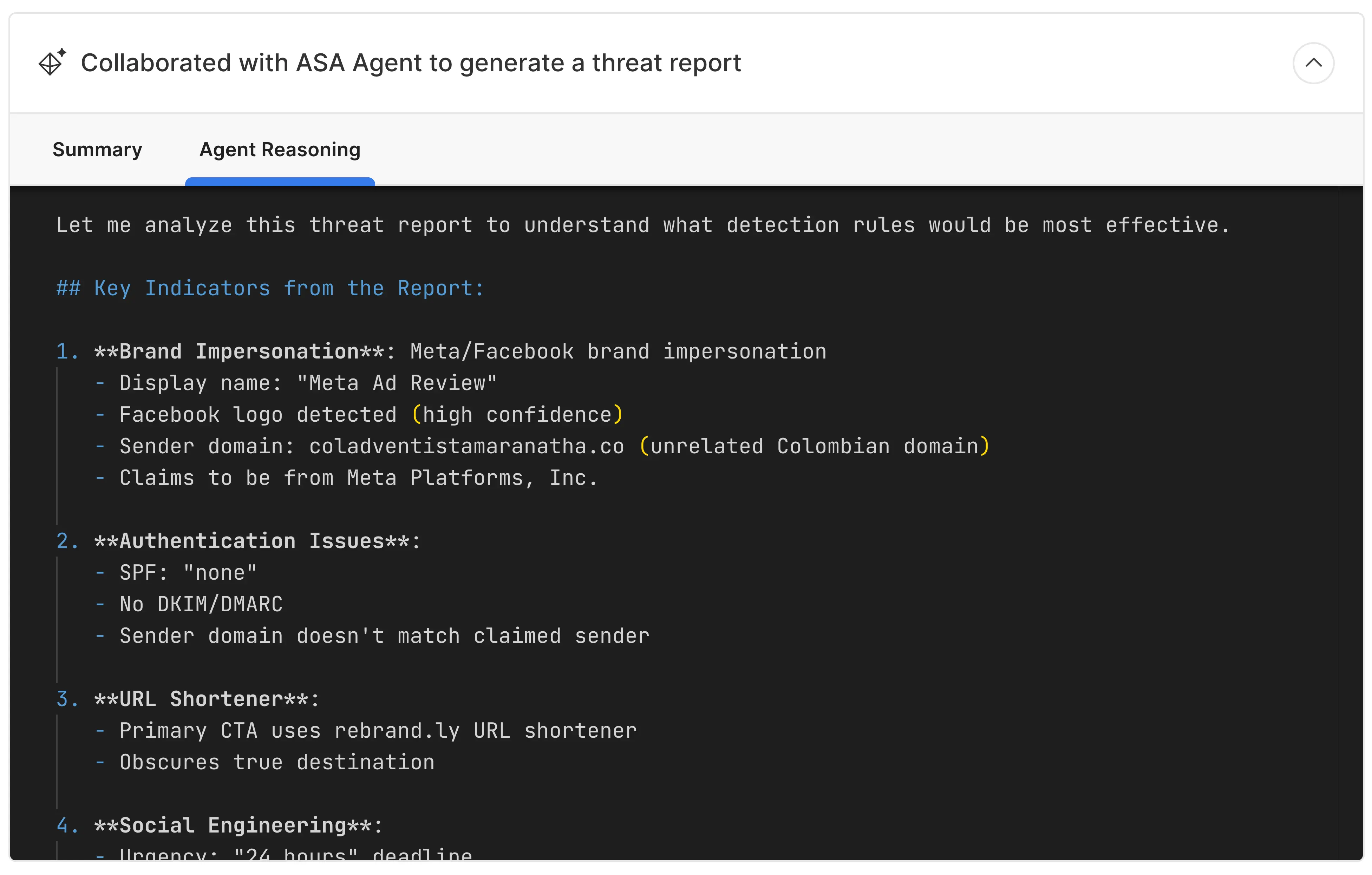 ADÉ now surfaces its full chain of thought – an explanation of everything it considered during the detection-building process, from initial analysis through Hunt iteration. Combined with audit logs that show exactly what information ADÉ reviewed, teams can trace every step of the recommendation. This transparency helps analysts learn how ADÉ approached the problem and build trust in the output.