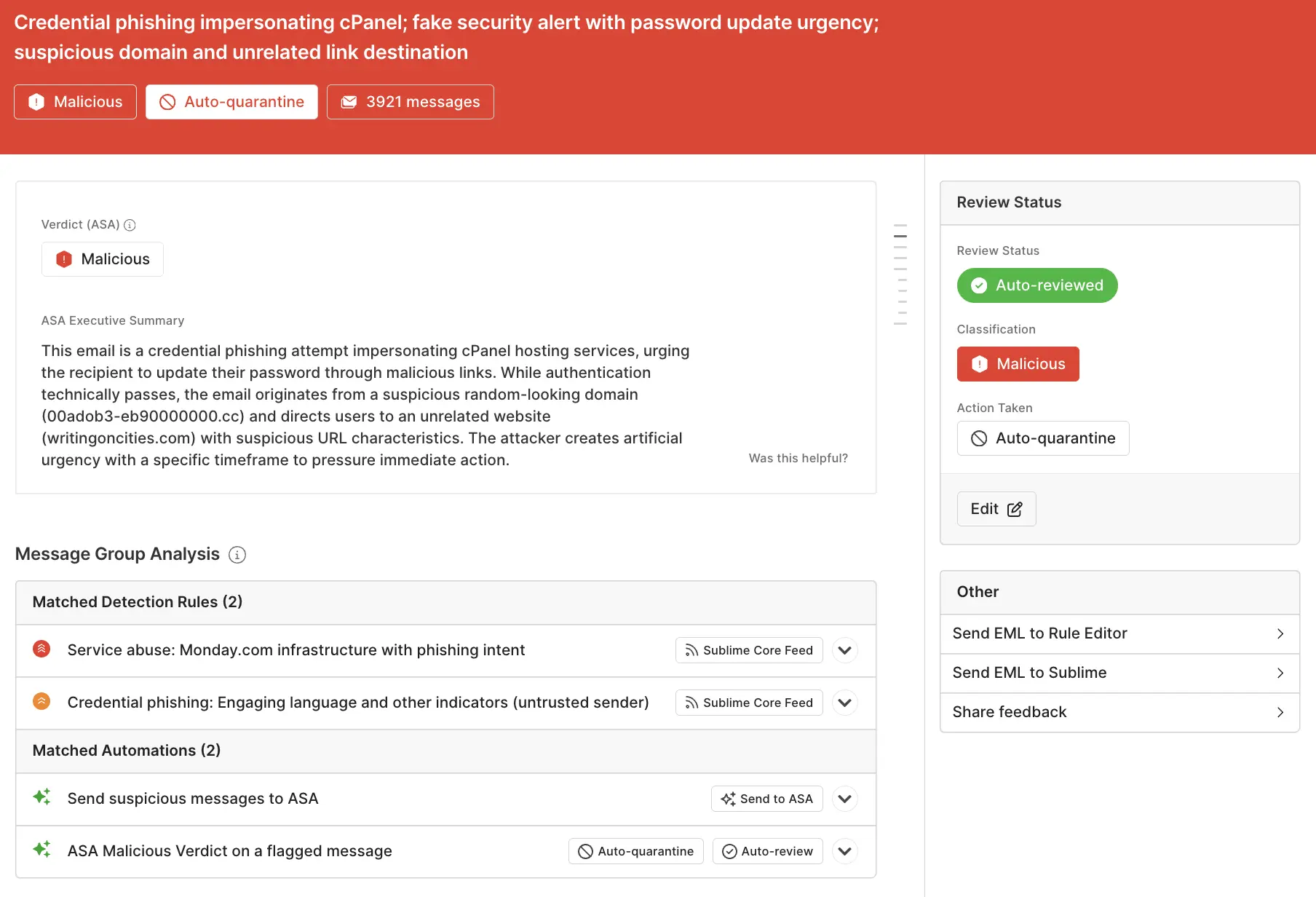 Today, we are excited to announce we’ve extended ASA’s coverage. Specifically, ASA now analyzes messages that Sublime has flagged as suspicious or unknown, as these two verdicts would have previously required further analysis by the security team.
