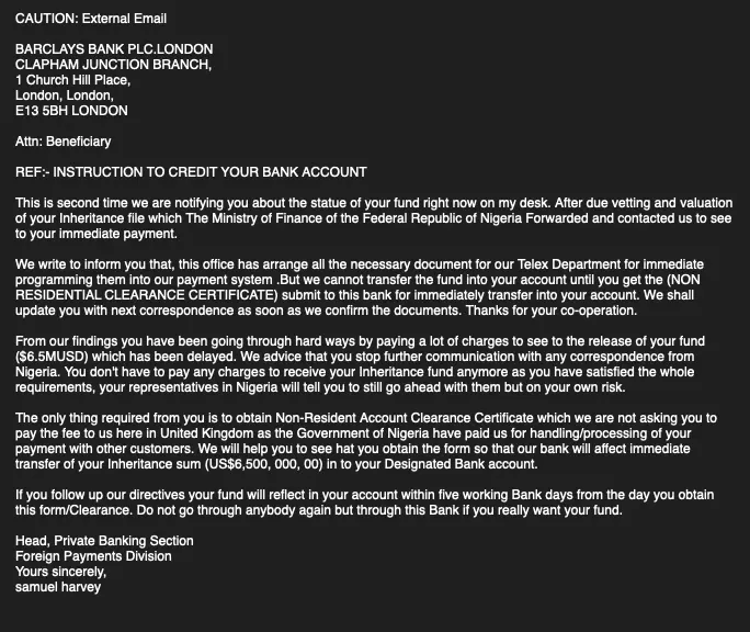 We've seen a wide range of variants, but generally, the email messages sent from compromised servers are straightforward, plaintext fraud attempts. Here's an example of one of these attempts: