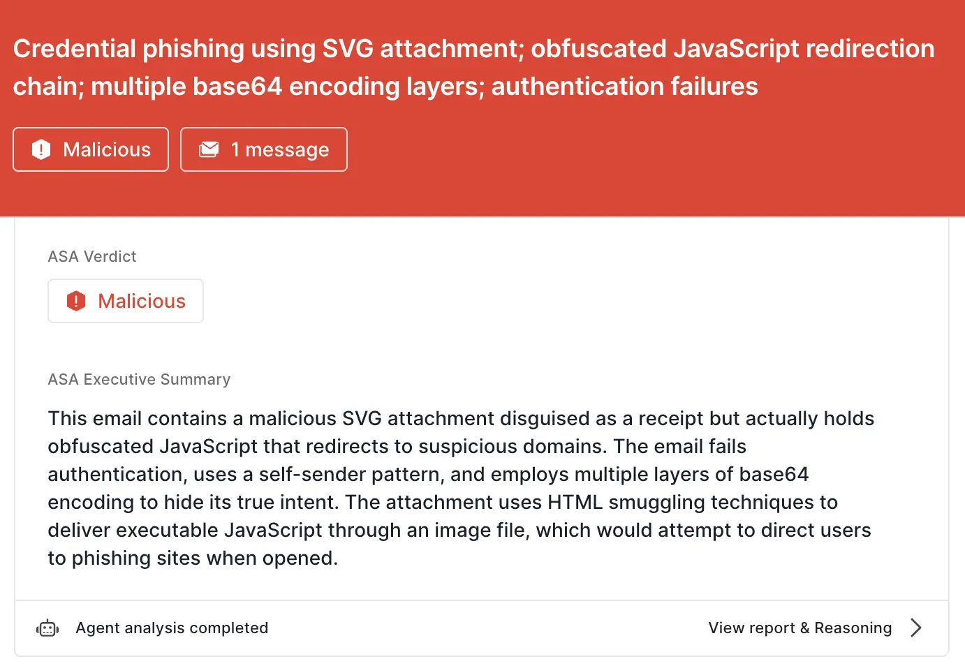 ASA, Sublime’s Autonomous Security Analyst, flagged these emails as malicious. Here is ASA’s analysis summary for this message: