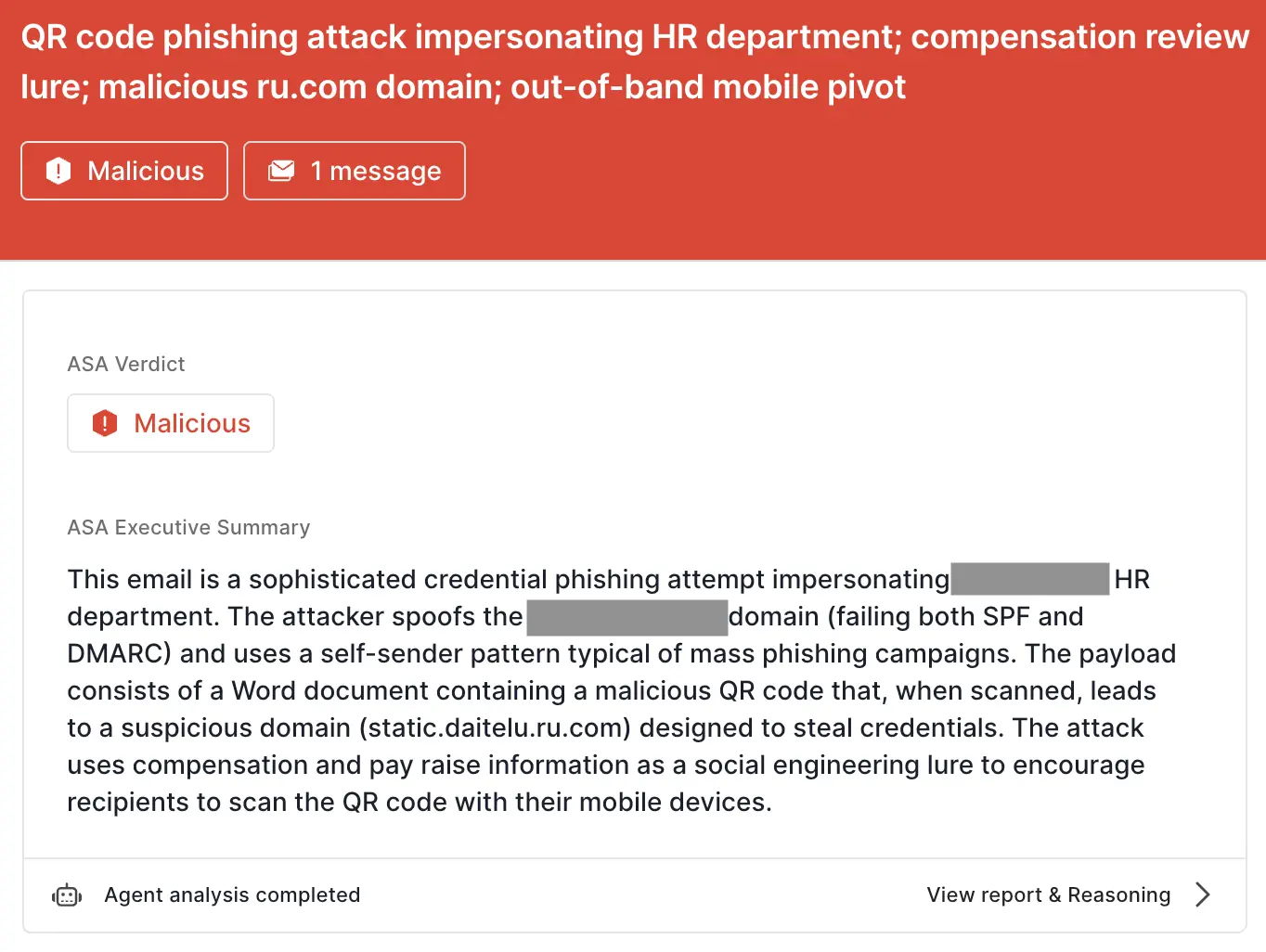 The .docx file, though, contains a QR code that can be scanned to get to an “Employee Pay Raise and Bonus Allocation” site. Both inconsistent intent (subject and attachment mismatch) and out-of-band pivots (moving from inbox to mobile camera scan) are common attack signals.