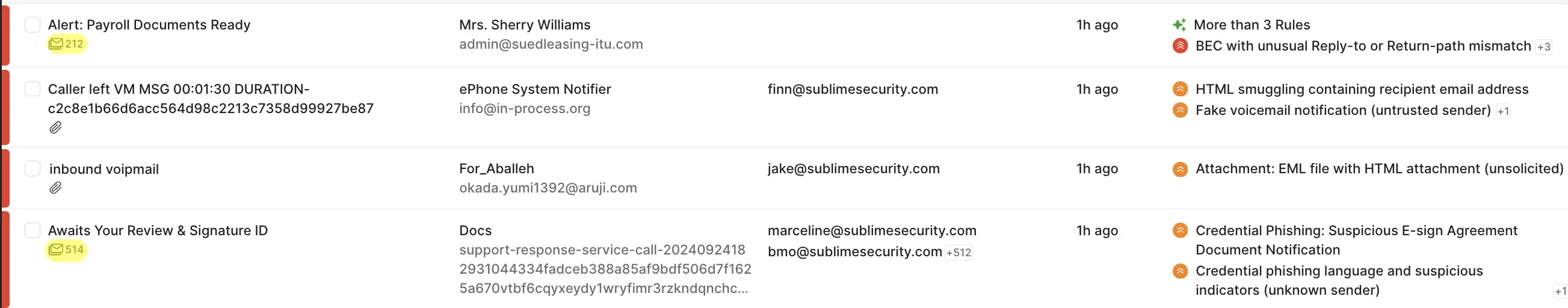 As an attacker sends out slight variations on a message across multiple mailboxes, Sublime runs Detection Rules against each message before grouping based on content. Grouping similar messages after individual analysis enables consistent remediation across every variation of the attack.