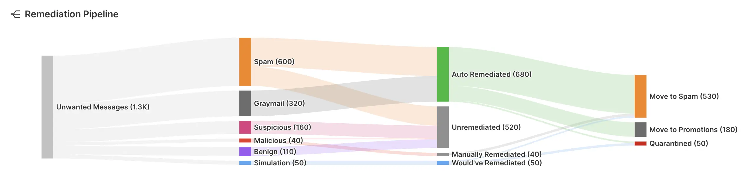 We also added spam, graymail, and email bomb analytics, as well as an interactive Remediation Pipeline visualization that lets you quickly see how unwanted messages were remediated and how much remediation happened automatically.