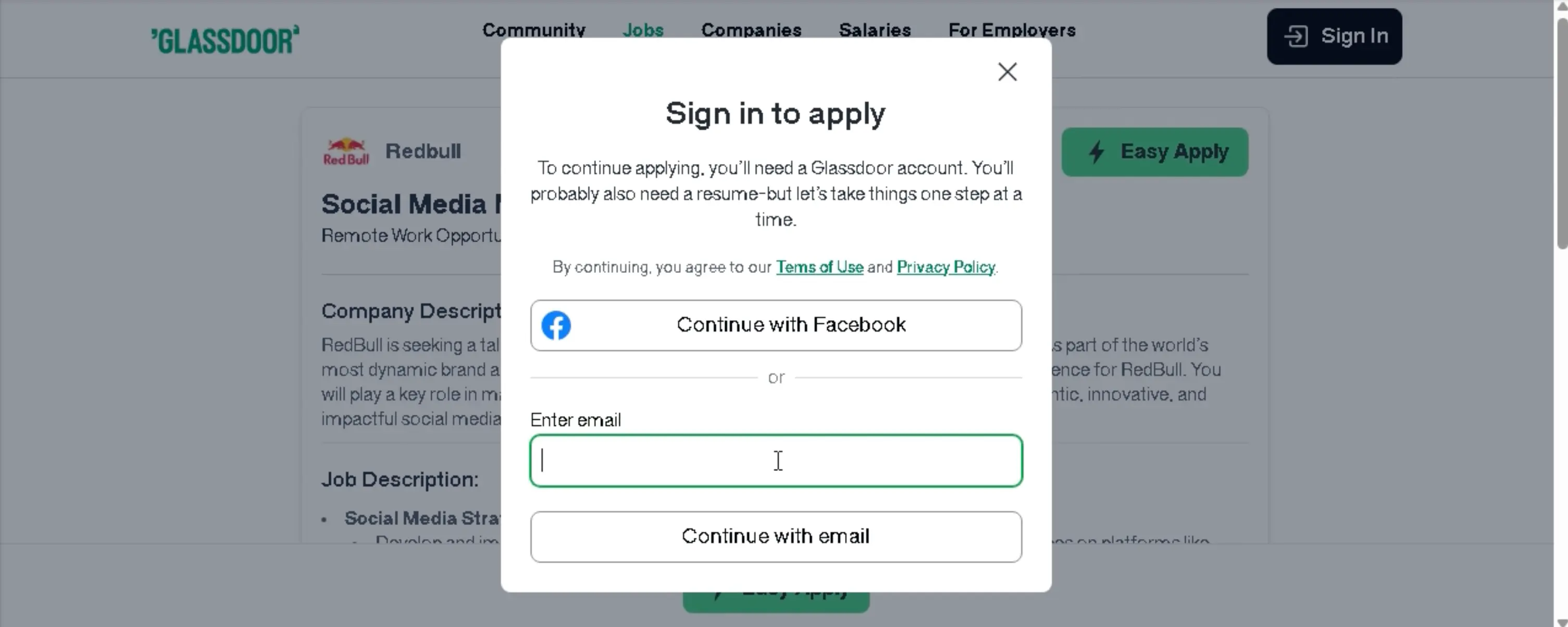 After clicking Easy Apply, the target is taken to a fake Glassdoor login where they can login with their email address or Facebook account.