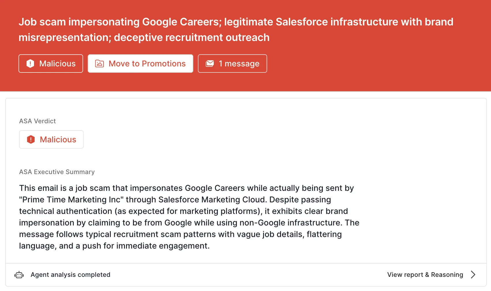 www.redbull@rebrand[.]ly, which make it appear as if the link leads to redbull[.]com when it actually directs to rebrand[.]ly.alexa.redbull-talent-recruiting.redbull[.]com), the sender is messaging-service@post.xero[.]com, and the reply-to is alexa.redbull-talent-recruiting@trustedbds.com.ASA, Sublime’s Autonomous Security Analyst, flagged this email as malicious. Here is ASA’s analysis summary: