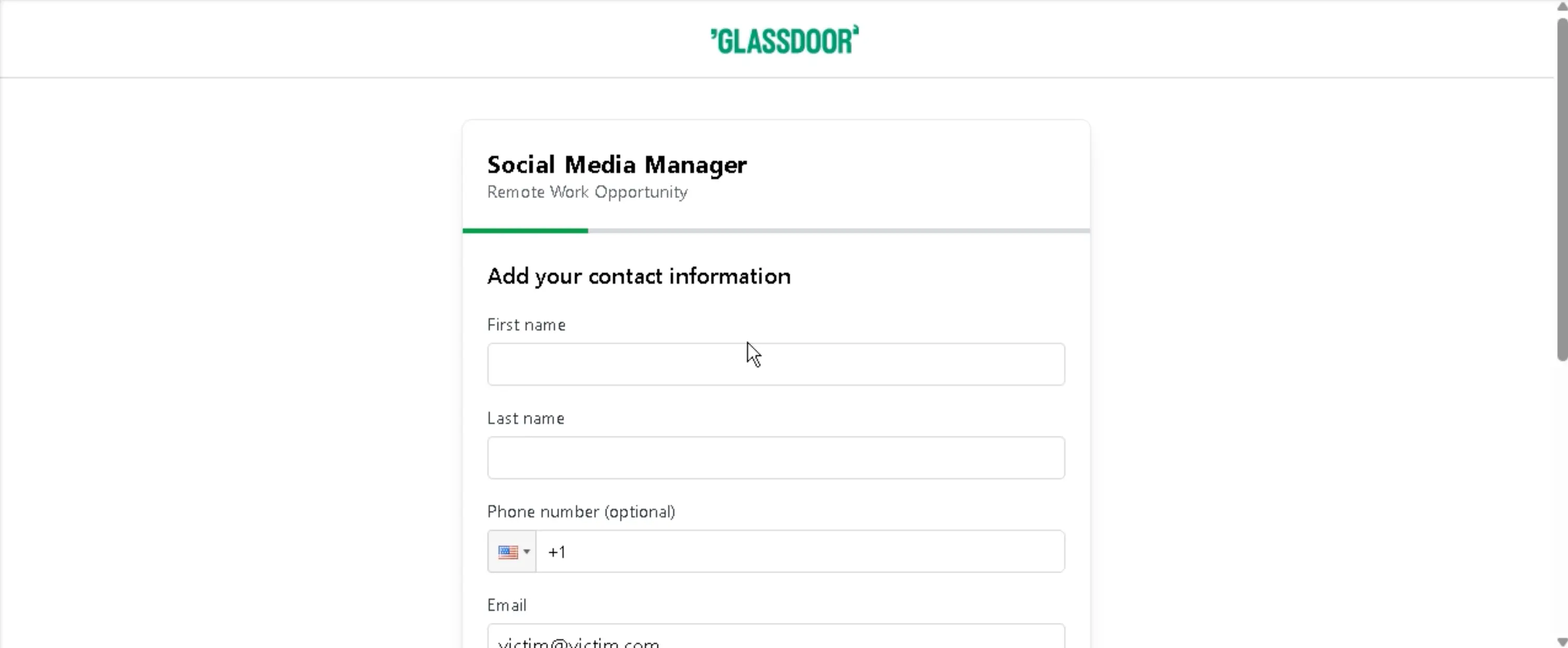 Once the challenge is completed, the target is taken to a fake Glassdoor job listing.
