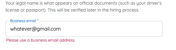 Another interesting artifact we noticed in some attacks was the filtering out of non-business emails. Below is a code snippet used to filter and the response from the form: