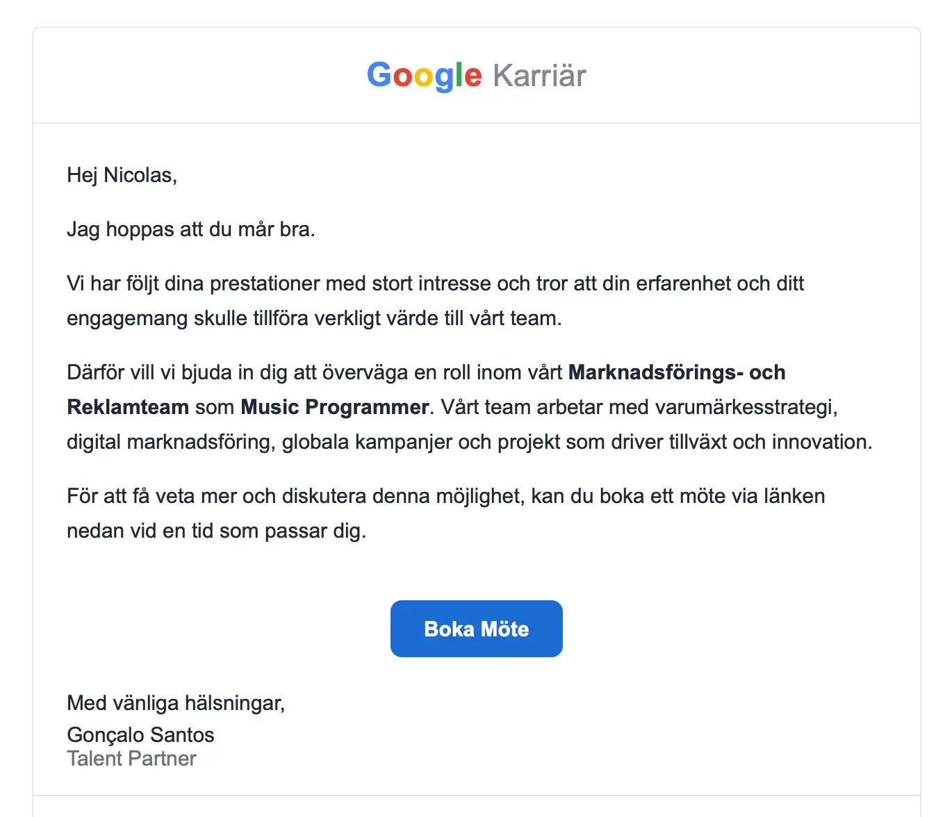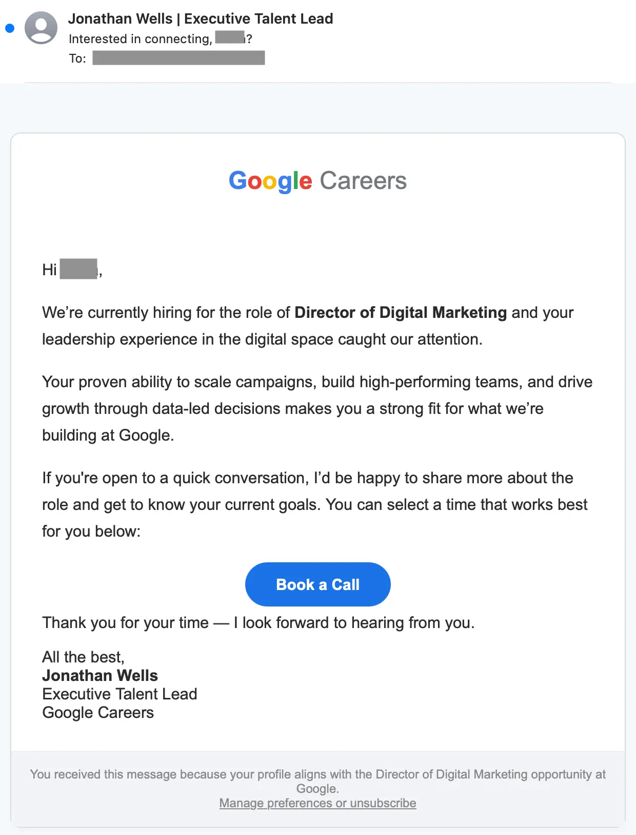 This attack begins with a message impersonating a Google Careers outreach about a job opening: