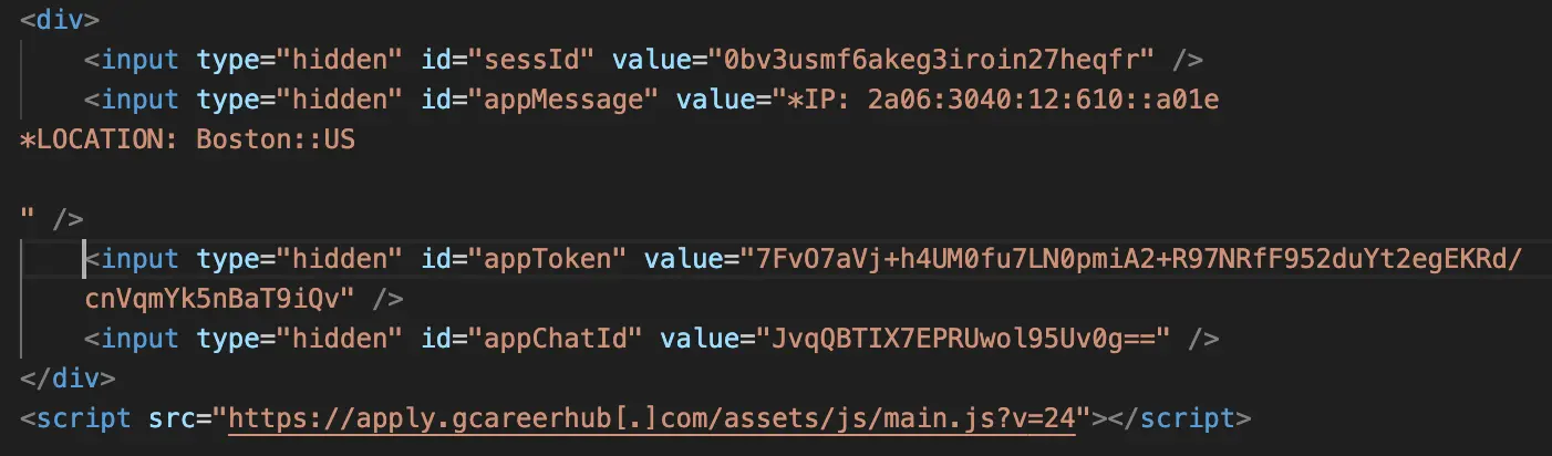 The following JS code was the response body for https://apply.gcareerhub[.]com/assets/js/main.js?v=24. Here are the relevant components of the .js file: