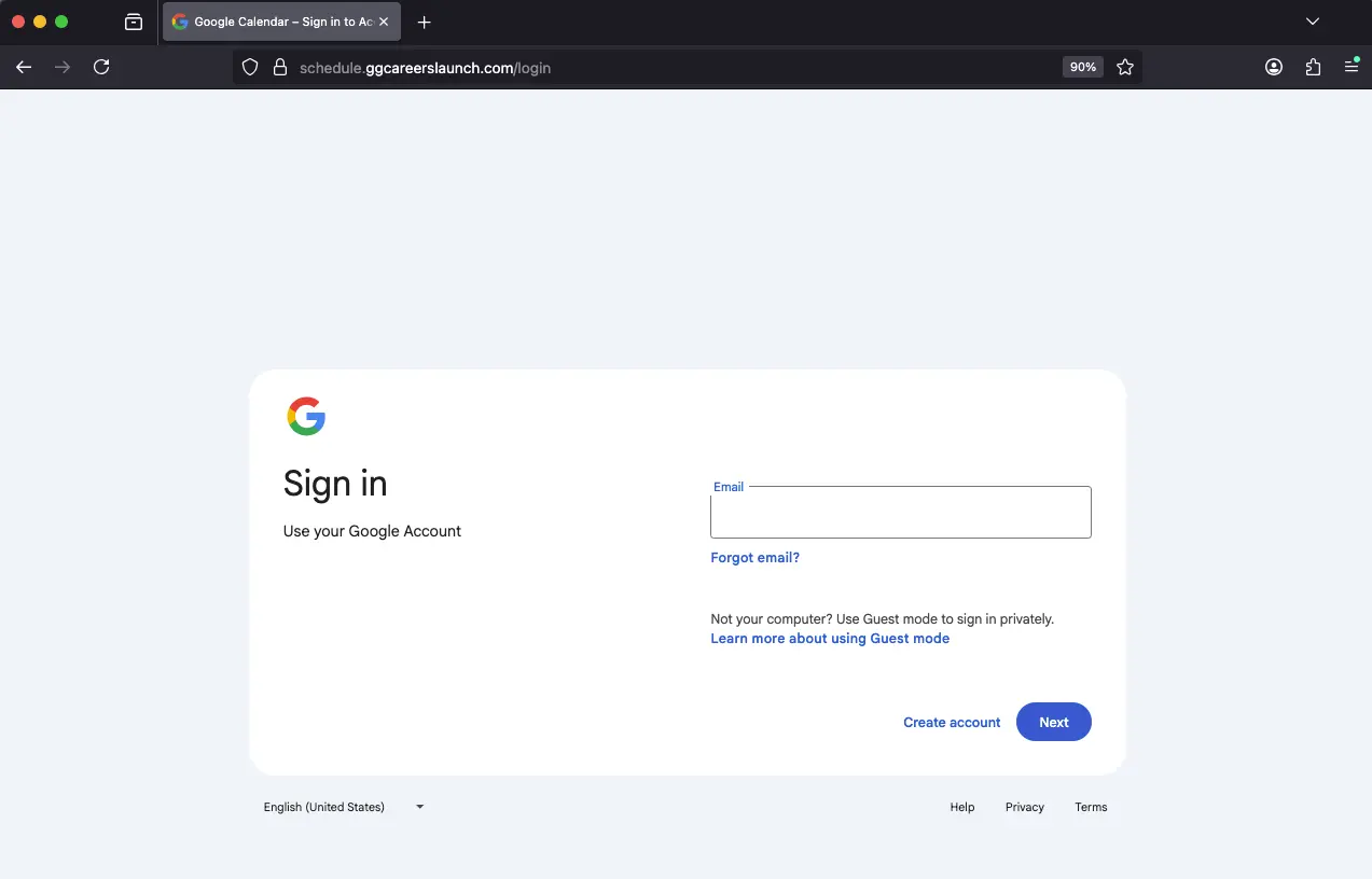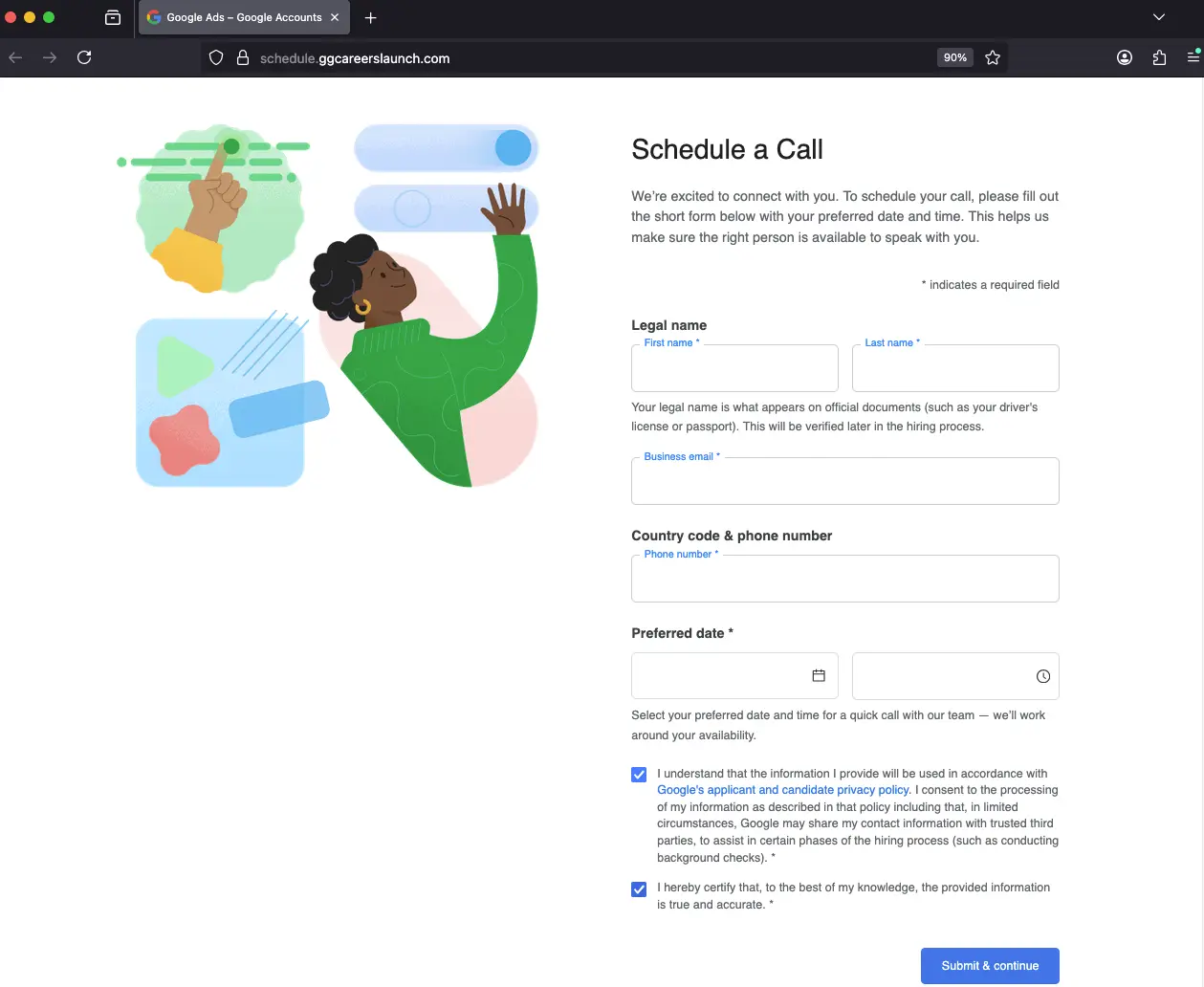 After confirming human status, they are then taken to a spoofed Google Careers meeting scheduling page. Here, there name, email, and phone number are all phished.