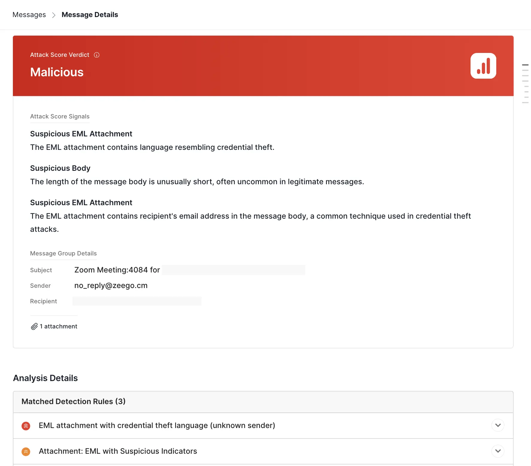 EML attachments are ubiquitous, often containing longer threads or related information to the parent email. Some email clients, including Outlook, will automatically render EML attachments within the parent email without user interaction, making it an attractive evasion technique. In this attack, an attached EML file is used to hide a malicious link from detection. Attack characteristics: