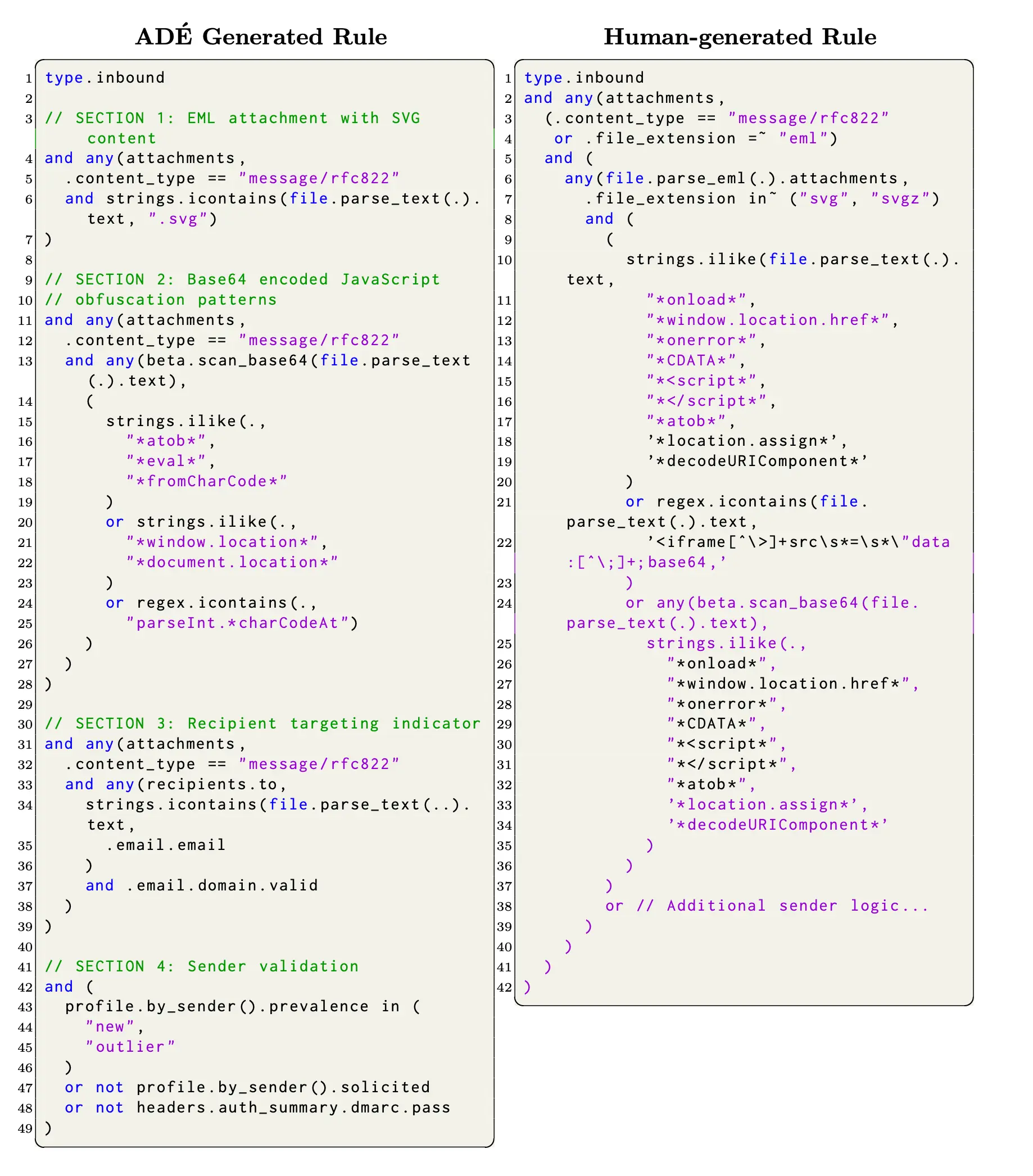 Using the above framework, we can see how Sublime’s Autonomous Detection Engineer (ADÉ) performs compared to a human detection engineer. Let’s start with the construction of the rule: