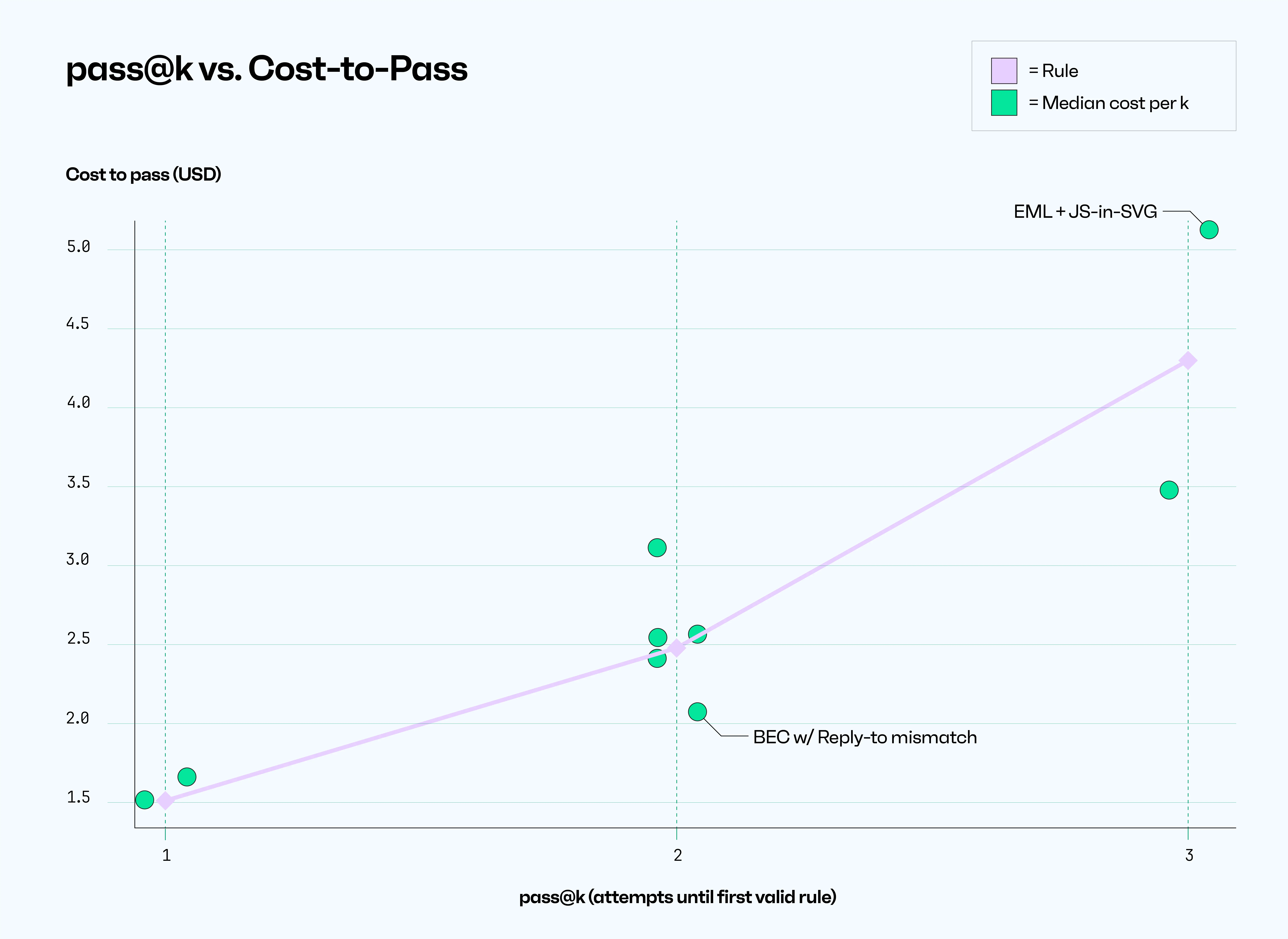 What is pass@k? pass@k is the chance that, if an agent makes k attempts, at least one is valid. We pair pass@k with cost-to-pass (the actual dollars spent to achieve a valid rule), so teams can judge speed and spend, not just success in the abstract.