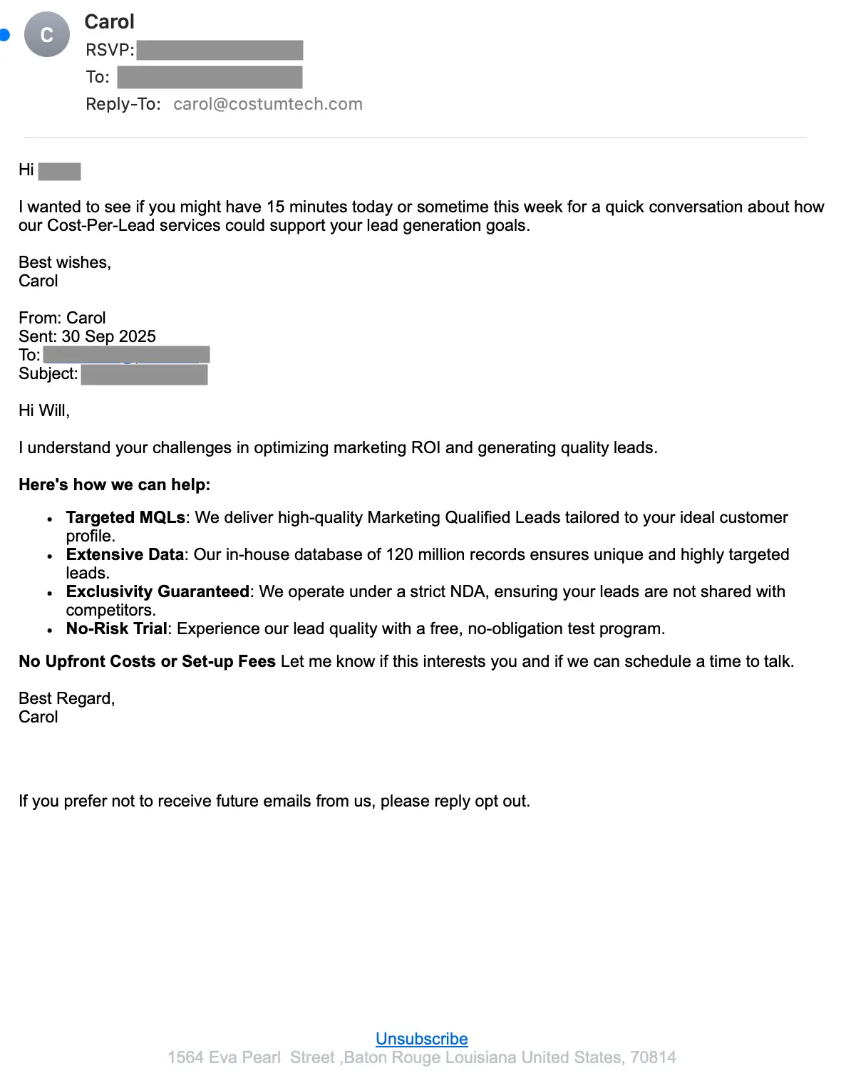 The first type of message we’ll look at is also the highest volume type of message, with thousands being sent in bulk. The intent of these messages is to get the target to respond with an “opt out” message to unsubscribe. Responding confirms both target receipt and engagement. This small interaction could result in the target being added to a high intent spam list, the initiation of a BEC attack, and more. Here’s an example email:
