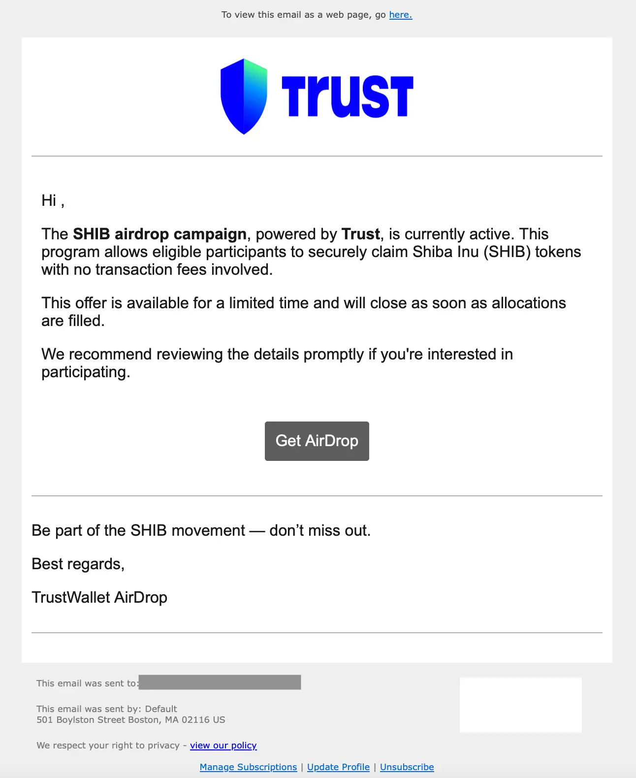 In this last attack, we see Salesforce being used to deliver a crypto wallet theft payload. Just like the previous attack, the bad actor uses the Salesforce email template with all of the legitimate management links. In this case, though, they impersonate Trust (a company that offers a crypto wallet) and offer a chance to participate in a Shiba Inu token airdrop.