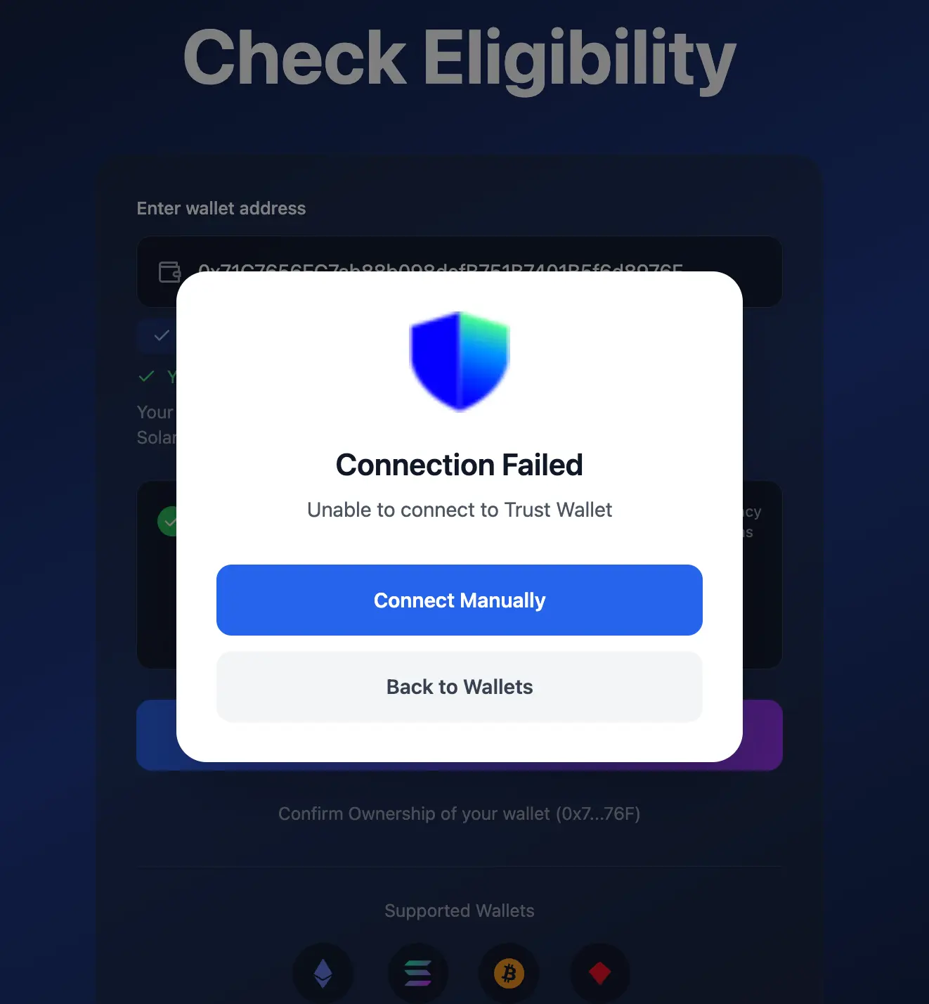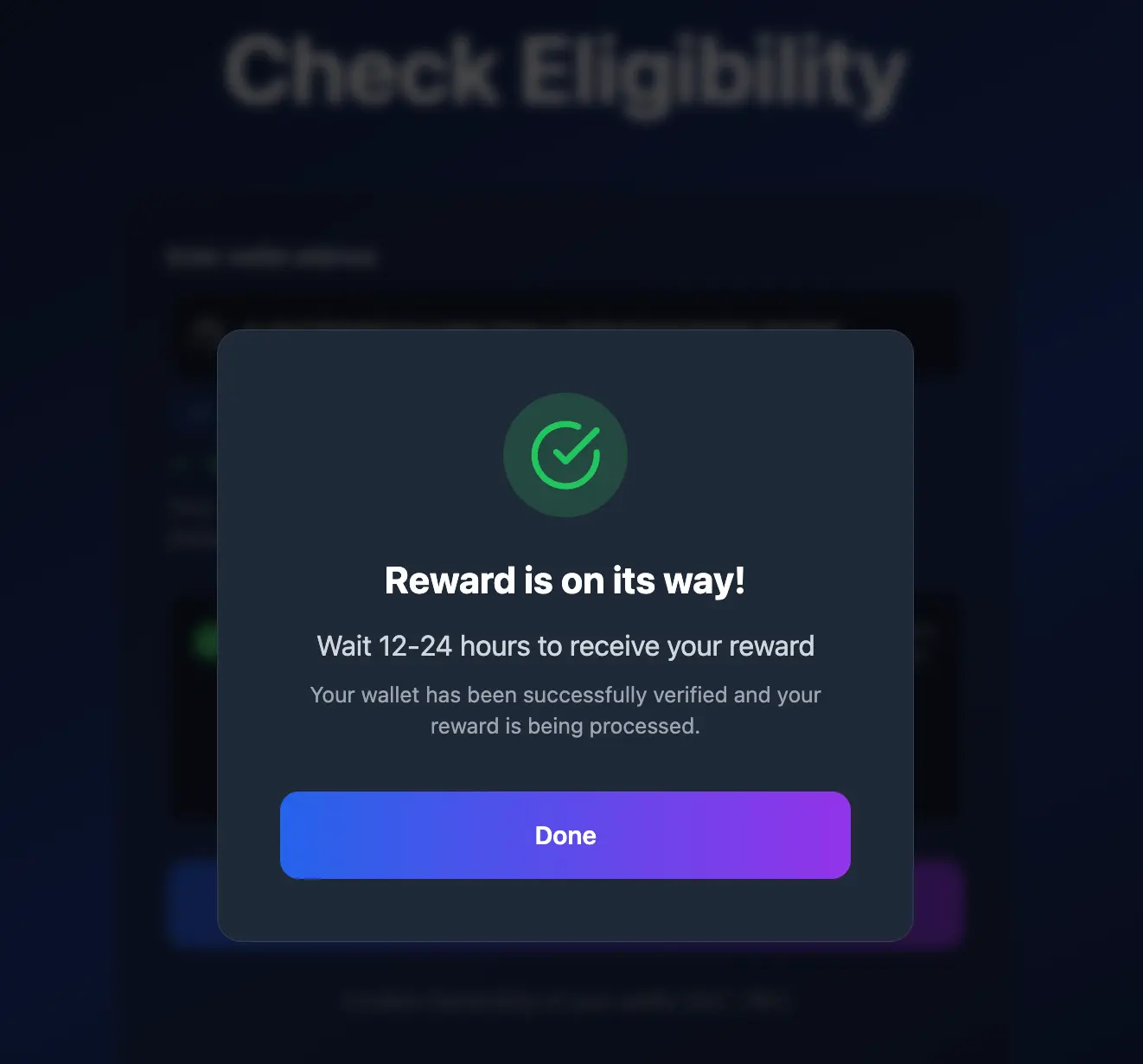 After filing out the 12 boxes and clicking connect, no validation occurs. Instead, the target is taken to a confirmation screen indicating a successful connection and the upcoming transfer of reward tokens.