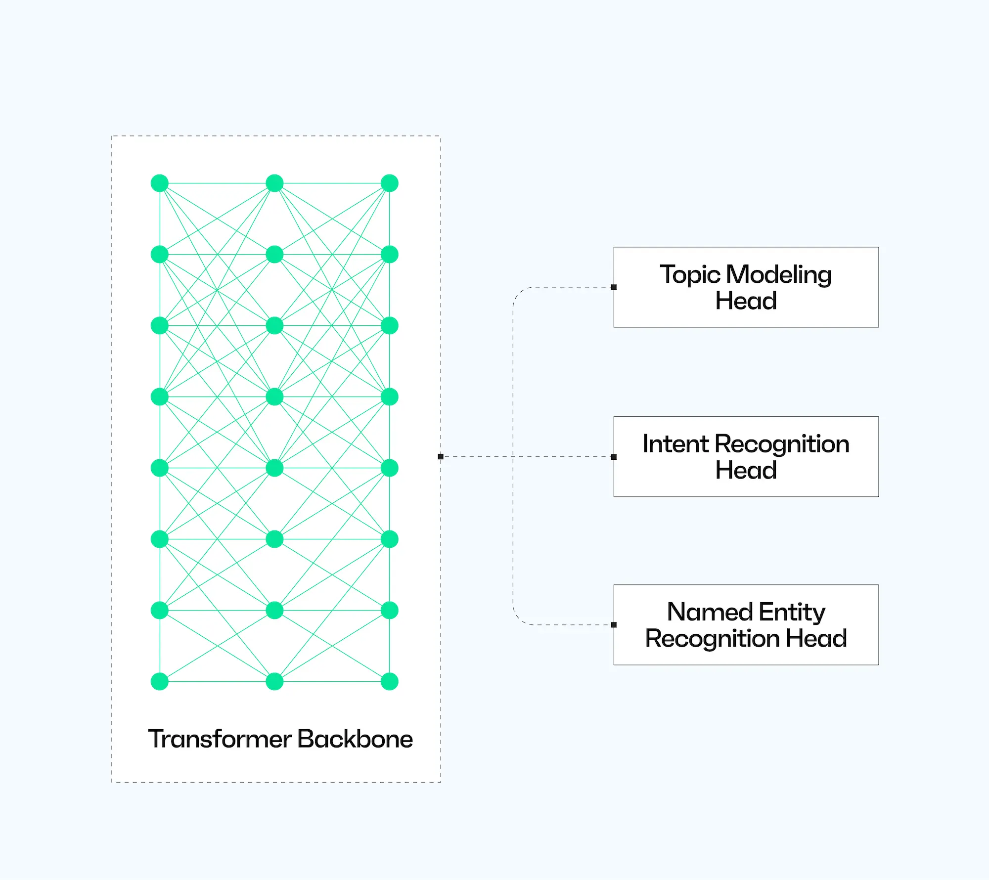 The multi-head setup is computationally efficient, too. With NLU 2.0, if we wanted to extract entities and classify intent, we’d run two separate analyses over the email text. Now, one pass through the transformer gives us all the answers at once. This reduces latency and ensures consistency across tasks.