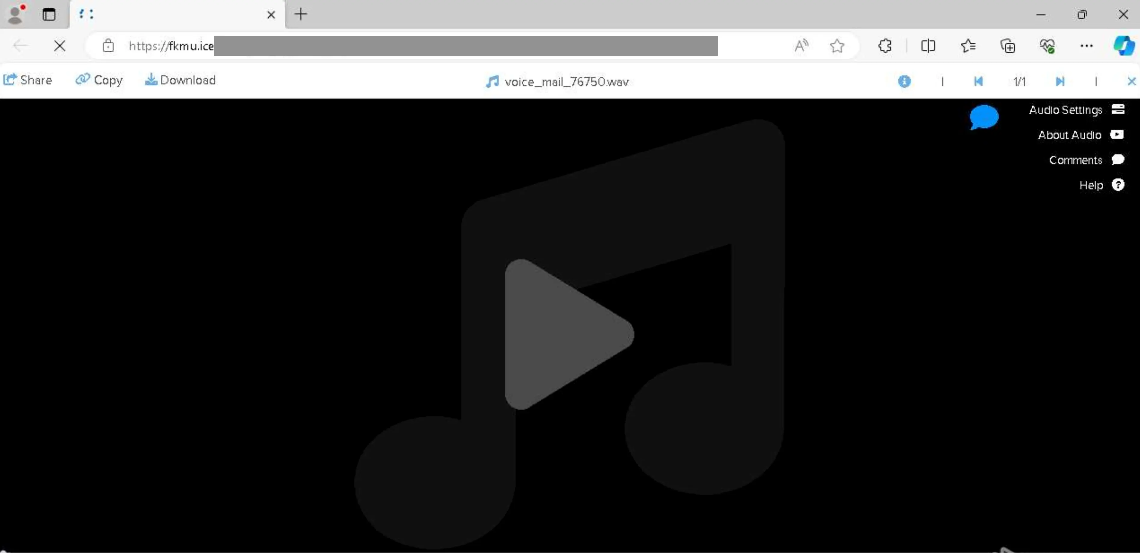 Next, the user is taken to a “play voicemail” page in Sharepoint. This page seems out of place because it is. Tycoon 2FA lets their customers (bad actors) spin up and launch new attacks quickly. In the case of this attack, it appears that the actor has recycled a template from a different attack involving a fake voicemail notification in order to launch this new one. Alternatively, the template they’re using was originally built for a fake voicemail notification scam.