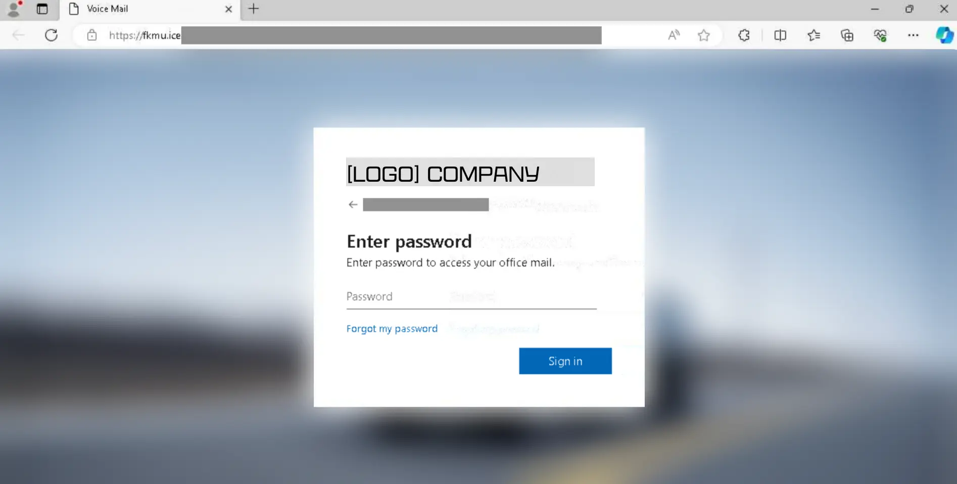 If the target clicks the play button, they are then redirected to an AITM login page that is a clone of their expected login page, featuring the company’s logo and their custom background. Note that the page title is “Voice Mail” as the page code was recycled from another attack.
