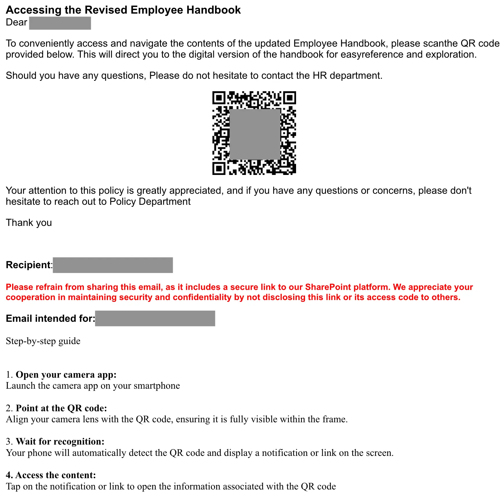 If the target opened the PDF, they saw an abbreviated employee handbook that featured “updates” in red and then provided a QR code in order to review the entire handbook within SharePoint.
