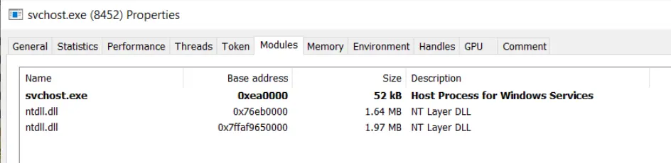 Continuing the execution, we observed and investigated the newly spawned svchost, and confirmed a second copy of ntdll present in the module listing. There are few legitimate reasons for two ntdll modules to be loaded, so we knew something strange was going on inside of this svchost.