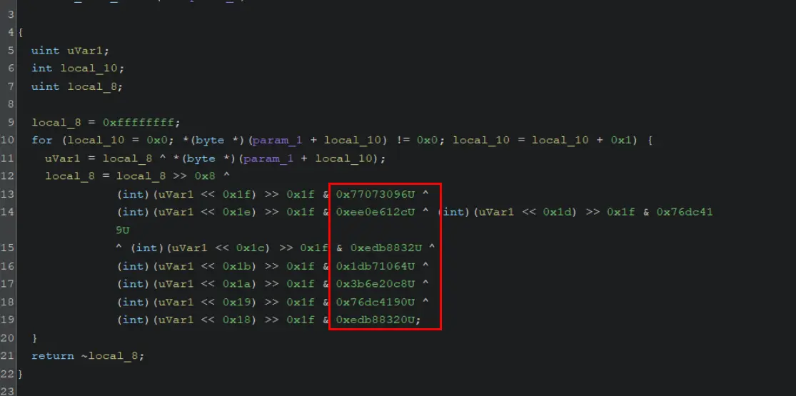 We were also able to locate the hashing algorithm within the shellcode, with constant values confirming the CRC32 usage.
