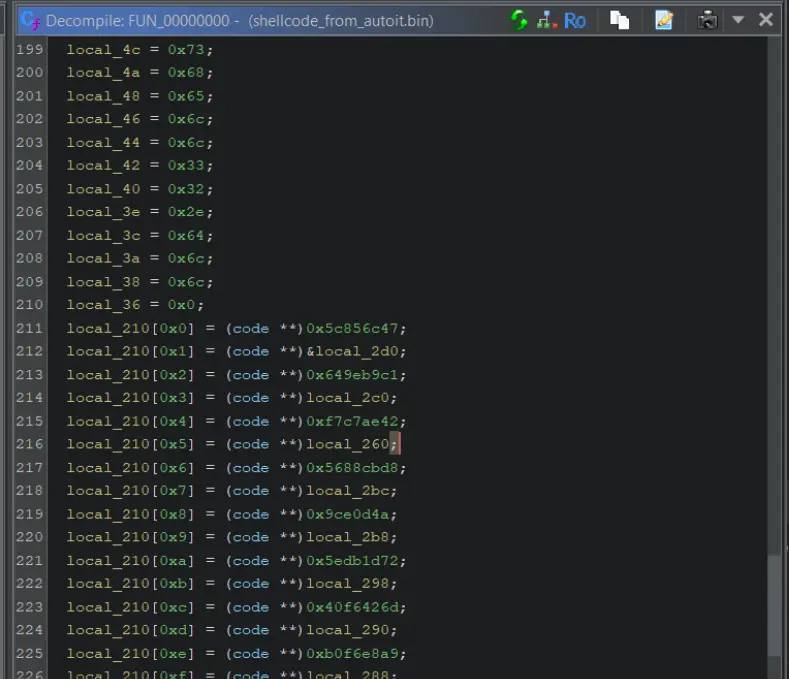 So far, we had identified that document.exe contained a malicious AutoIT script that featured shellcode for further execution. Initial attempts to execute the shellcode inside a sandbox had failed, so we then moved the data into Ghidra in order to work out what it was doing and which malware family it might belong to.