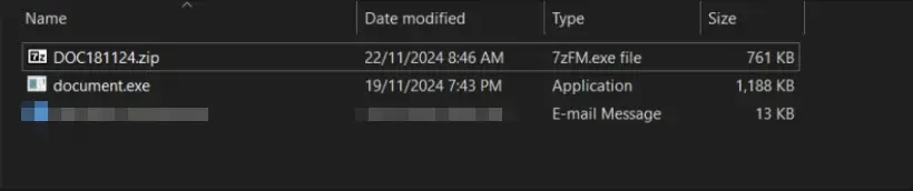 The Open files button led to a .zip file hosted on a non-SharePoint URL. Within a safe environment, we downloaded and extracted its contents for further analysis: document.exe.