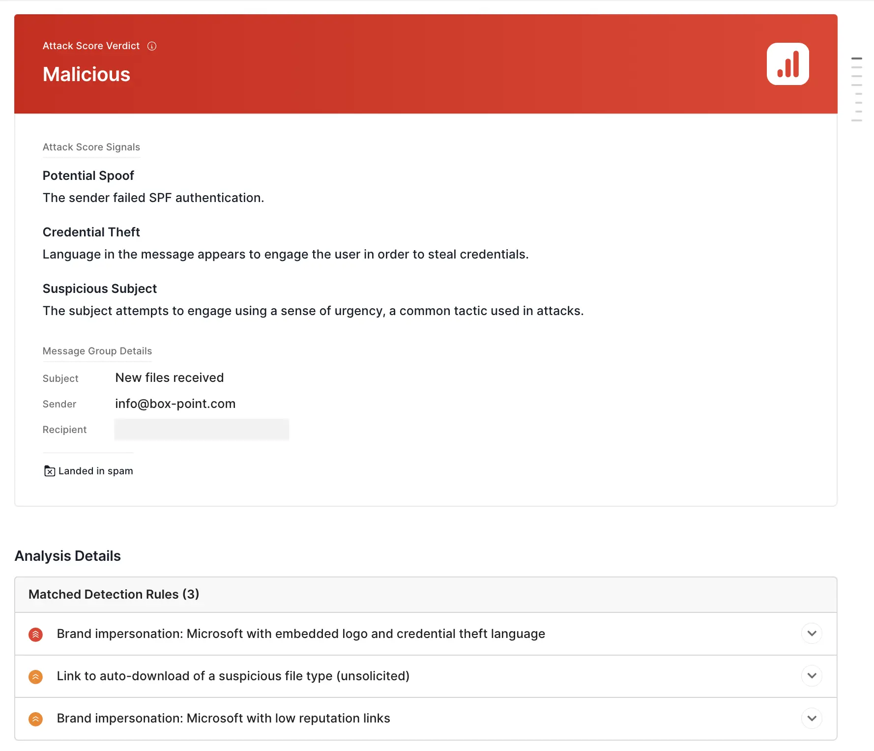Sublime's AI-powered detection engine prevented this attack. The top signals in these attacks are: