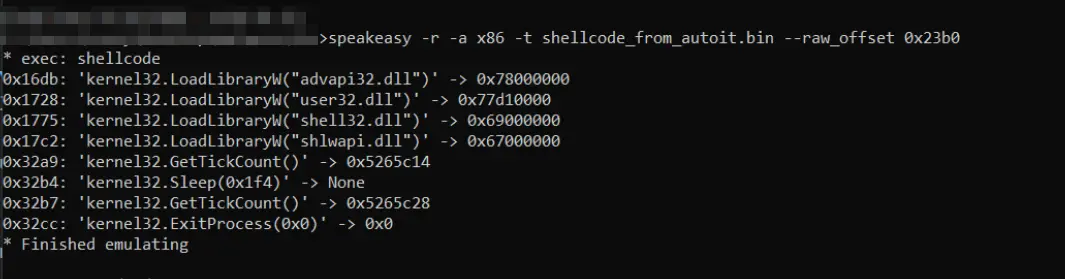 We then saved the resulting data and tried to execute it using the Speakeasy emulator by Mandiant. Speakeasy confirmed that the code would execute, but it terminated immediately after calling GetTickCount and Sleep. This is a common anti-analysis trick used by malware to defeat emulators and sandboxes.