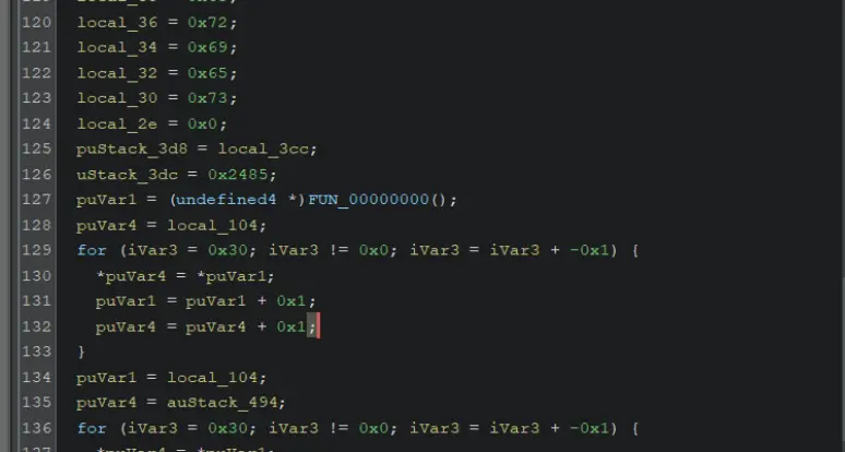Starting at the execution offset of 0x23b0, we noticed that the code contained numerous stack strings and quickly redirected the shellcode to an offset of 0 (indicated by FUN_00000000).
