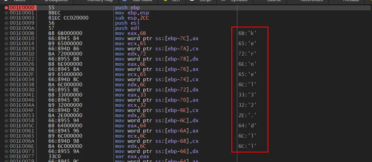 This enabled us to easily view remaining stack strings, which largely contained DLL names later used for resolving APIs.
