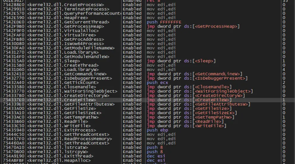 Here we have a simple conditional breakpoint that allowed us to monitor all APIs resolved via hashing.
