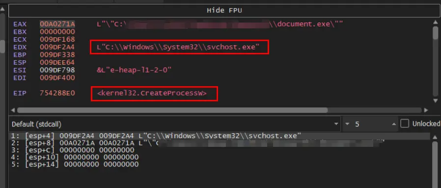 We also observed attempts to spawn an svchost.exe process via CreateProcessW. Given the presence of injection APIs, this is likely the injection target and where we’ll find the next stage of malware.