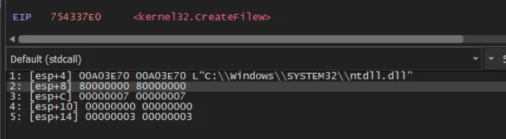 We also observed the shellcode attempting to load a second copy of ntdll.dll. This is often performed by malware in order to obtain a "clean" version for execution and is commonly used to evade detection with variants of syscalls or DLL unhooking.