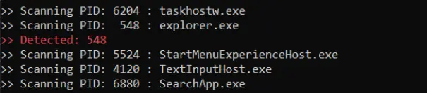Portions of the code did not execute and raised exceptions, so we decided to perform a more extensive scan of our analysis machine using hollows_hunter. Specifically, we wanted to use hollows_hunter to search for indications of shellcode present in any process that was currently running.