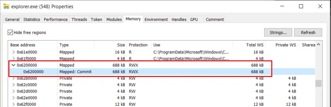 Inspecting the explorer.exe process further, we noticed another suspicious area of RWX memory.