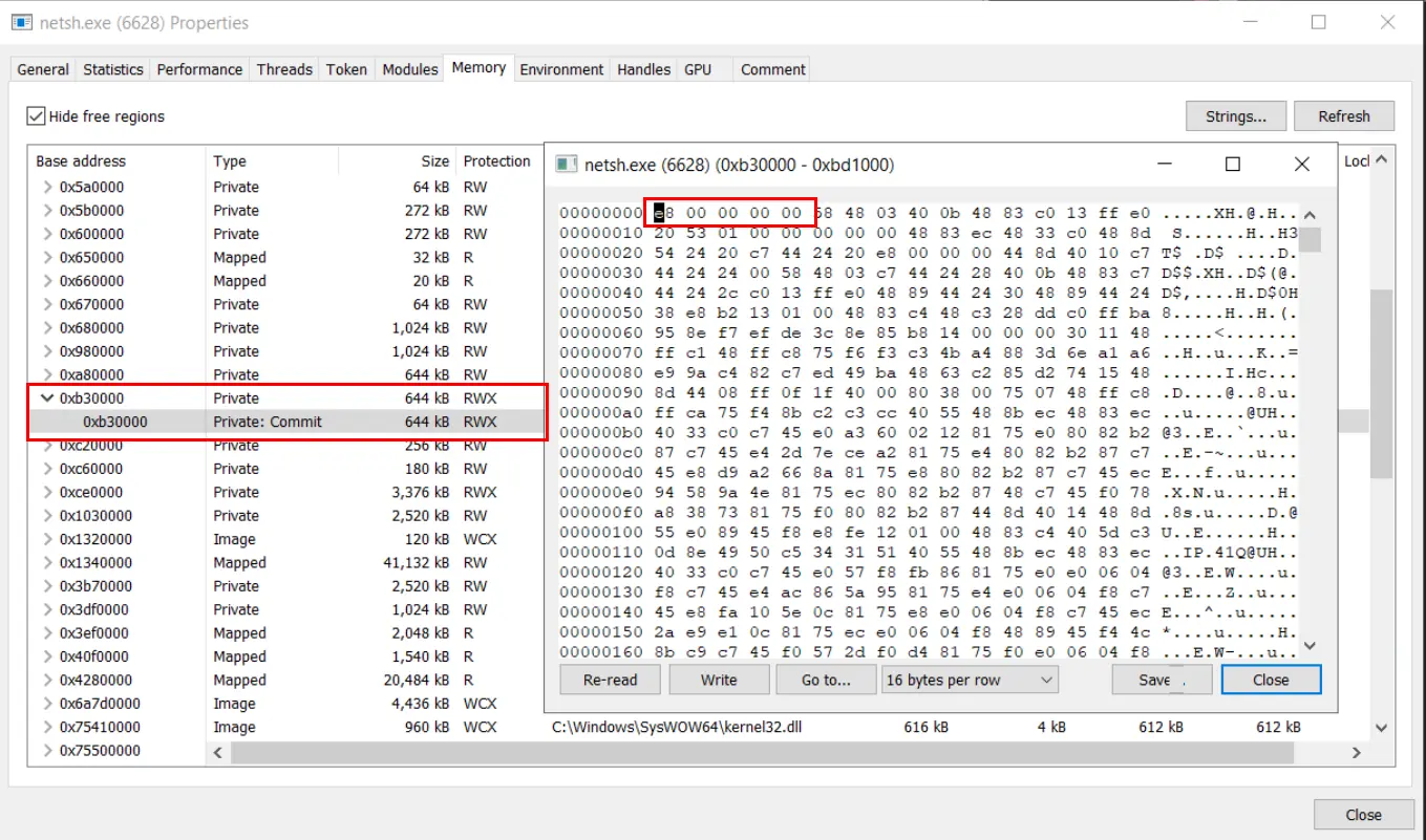 By closely inspecting the memory regions of netsh.exe, we noticed a suspicious area of memory with RWX (read/write/execute) permissions and what appeared to be shellcode.