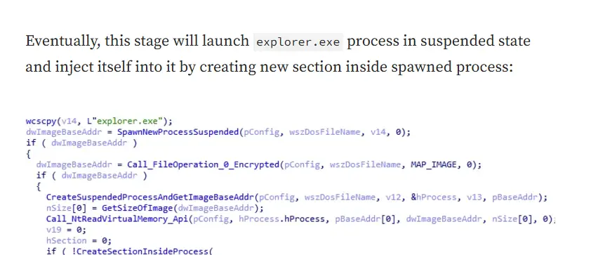 This revealed many of the APIs that the shellcode was resolving. Of particular interest was the presence of CreateProcessW, VirtualAlloc and ReadProcessMemory, as well as GetThreadContext and SetThreadContext. These APIs are commonly associated with process injection and further suggested we were dealing with a loader and not a final payload.
