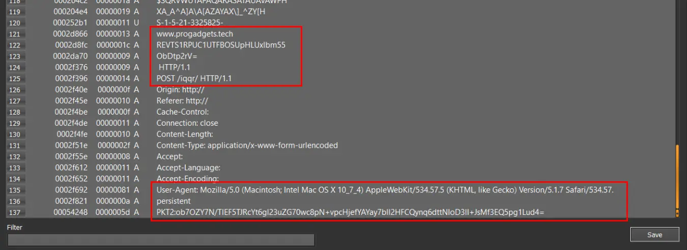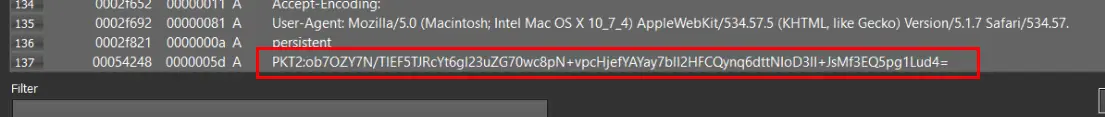 We then used Detect It Easy to search for strings in that saved region. We quickly discovered a domain, partial URL, user agent, and base64 data prepended with the string "PKT2". These are all strings that would be expected in code that is attempting to make an external connection. Since these strings were present in the dump (and located in an RWX section), we suspected that this was linked to our malware.